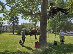 Left – Novice Climbers learning the fundamentals inside of the Olds College Arboriculture Climbing Lab.